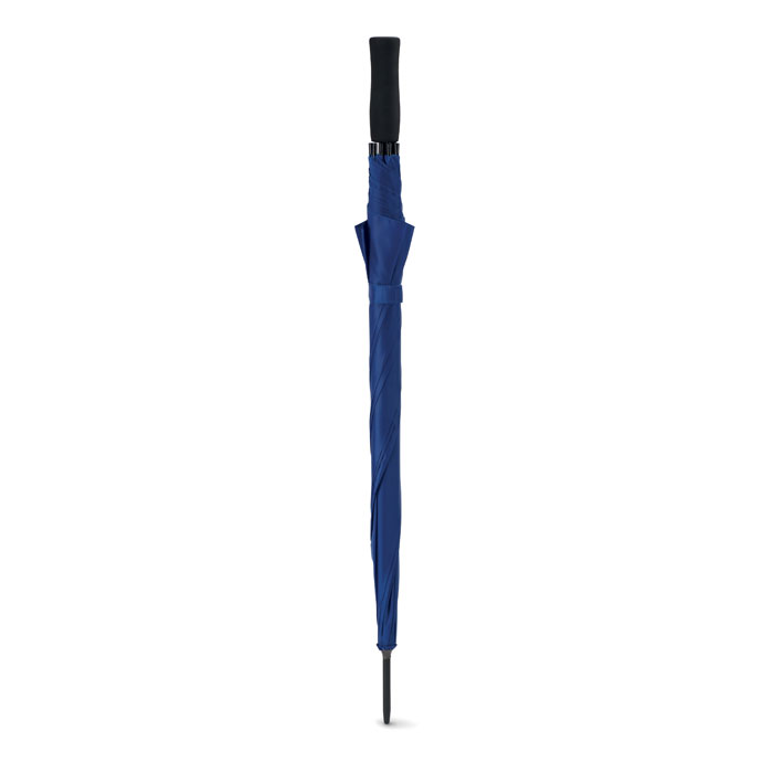 Зонт полуавтомат устойчивый к ветру с черным металлическим стержнем и черной пластиковой ручкой. Длина в сложенном виде 23 см.