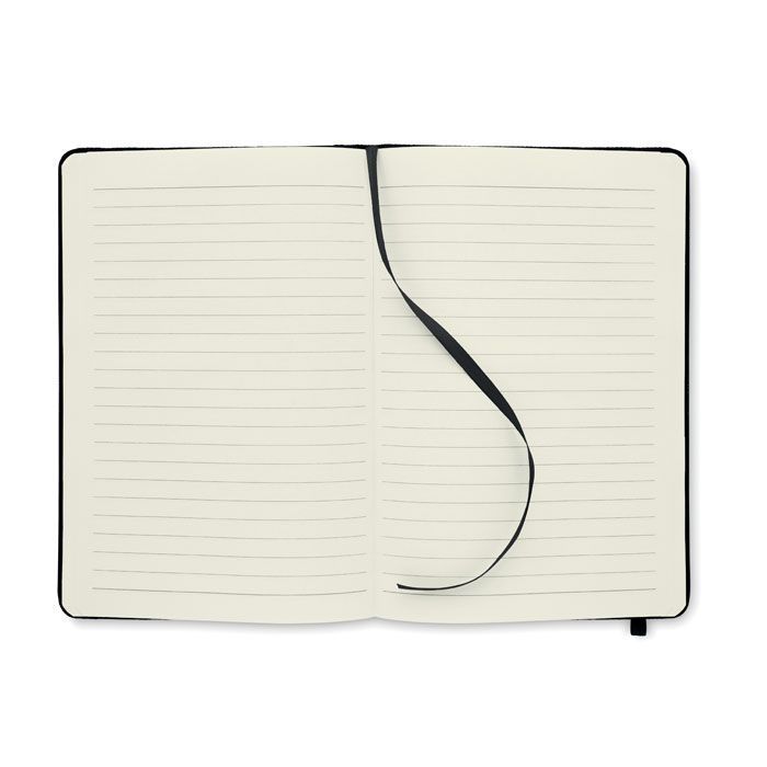 Блокнот A5 с обложкой из RPET 600D. Блок на 80 линованных страниц из переработанной бумаги с резинкой и закладкой.
