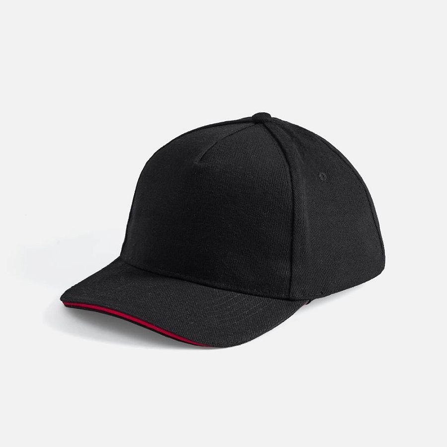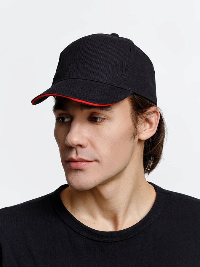 Модель бейсболки с 5-ю клиньями без лобового шва из плотного чесаного хлопка.
