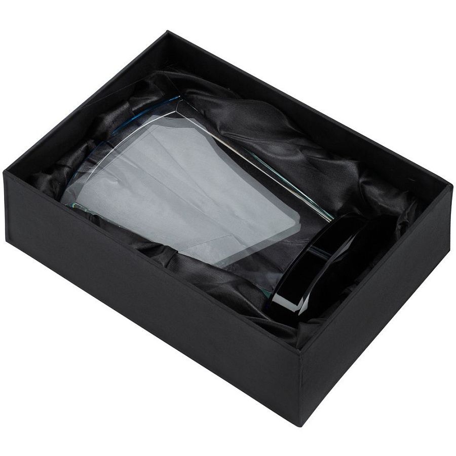 Стела изготовлена из стекла К9, в основе которого лежит оптическое боросиликатное стекло. Эту марку стекла отличает низкий процент посторонних включений, высокий показатель преломления и высокая прозрачность — идеальные качества для изготовления наград премиального уровня.