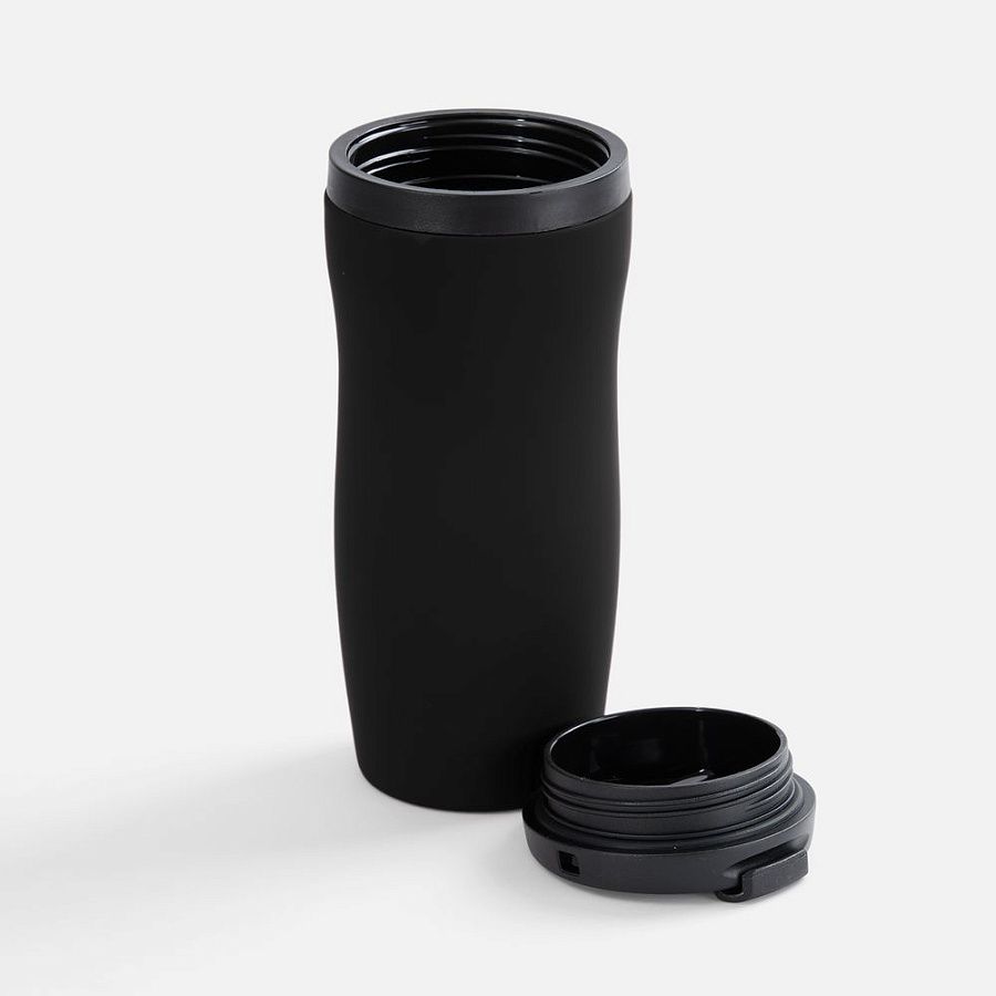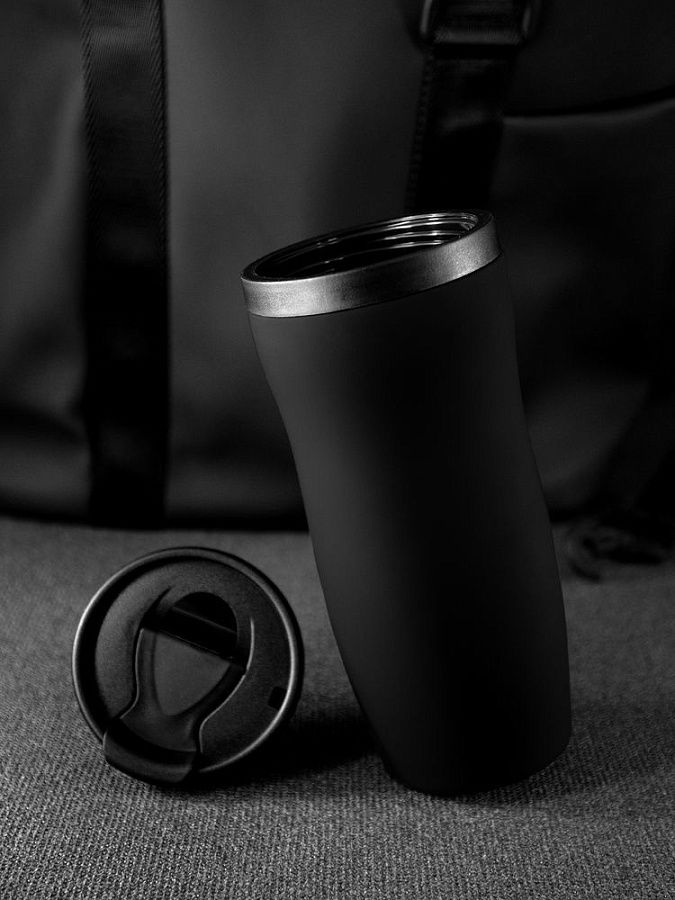 Двухслойная конструкция из нержавеющей стали снаружи и пищевого пластика внутри. Герметичная завинчивающаяся крышка с откидным клапаном для питья. Покрытие софт-тач. В отверстие в крышке можно вставить шнурок для удобного ношения стакана на руке. Шнурок в комплект не входит.
