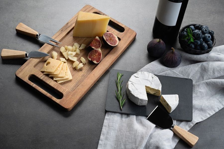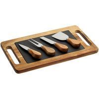 Поднос и рукоятки ножей выполнены из дерева акации, лезвия — из высококачественной нержавеющей стали.