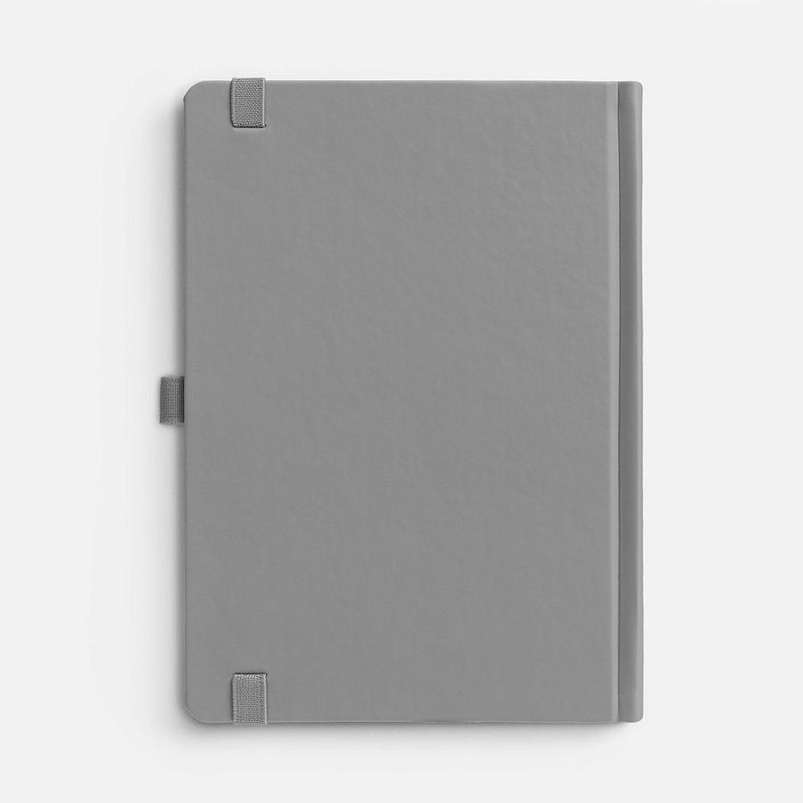 Ежедневник с твердой обложкой без поролона, выполнен из материала Soft Touch, серый СС, дополнен резинкой шириной 1 см, петлей-резинкой для ручки, капталом и ляссе серого цвета.