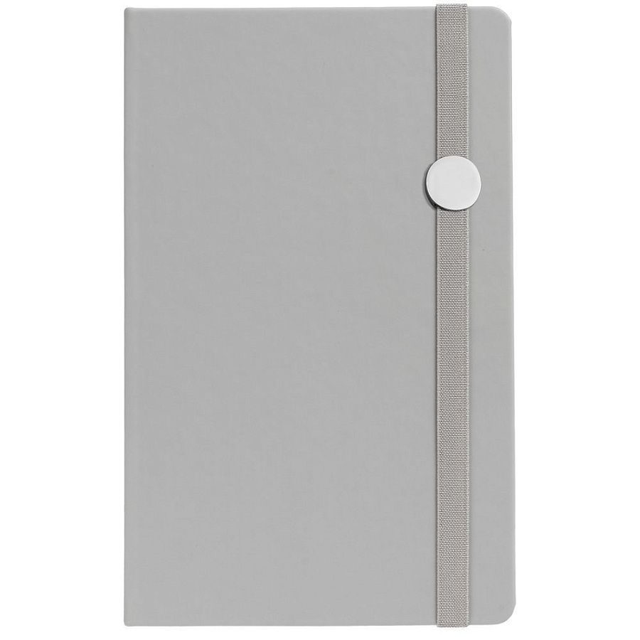 Блокнот в твердой обложке, выполнен из материала Soft Touch, серый СС, дополнен резинкой и ляссе в цвет обложки.