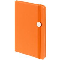 Блокнот в твердой обложке, выполнен из материала Soft Touch, оранжевый ОО, дополнен резинкой и ляссе в цвет обложки.