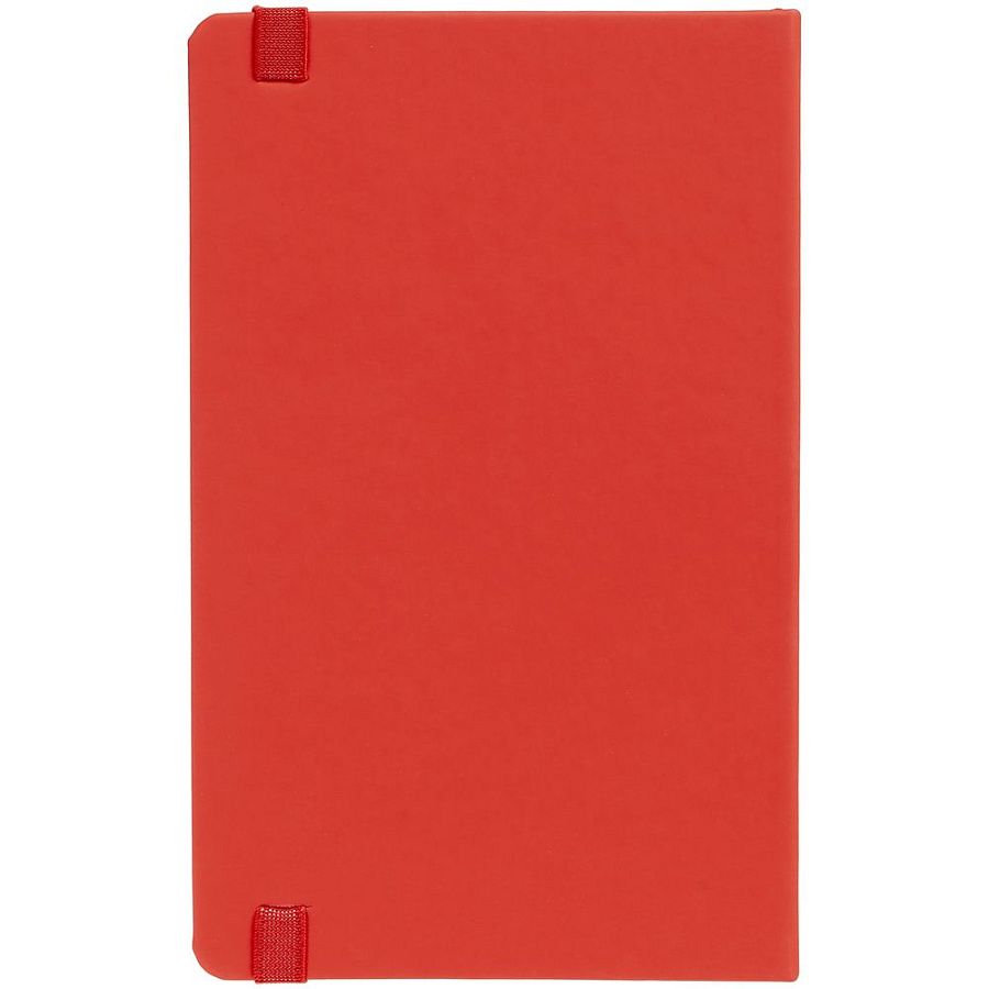 Блокнот в твердой обложке, выполнен из материала Soft Touch Ultra, красный РР, дополнен резинкой и ляссе в цвет обложки.