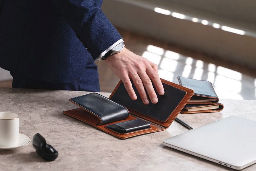 Чтобы передать этот удивительный контраст, для изделий Kalsa Palermo была выбрана гладкая натуральная кожа: глубокого синего цвета снаружи и светло-коричневого оттенка внутри. Оформленные в едином стиле, они легко собираются в подарочные наборы.