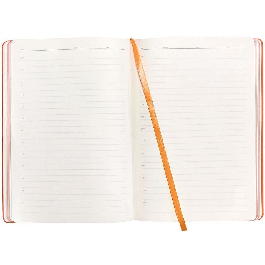 Ежедневник с гибкой обложкой, выполнен из материалов Soft Touch Pearl, оранжевый ОО, и Latte, оранжевый (внутренняя часть обложки), дополнен ляссе в цвет обложки с металлическим шильдиком.