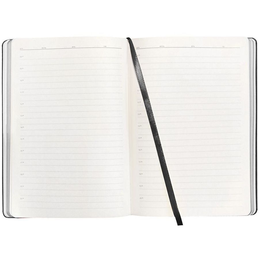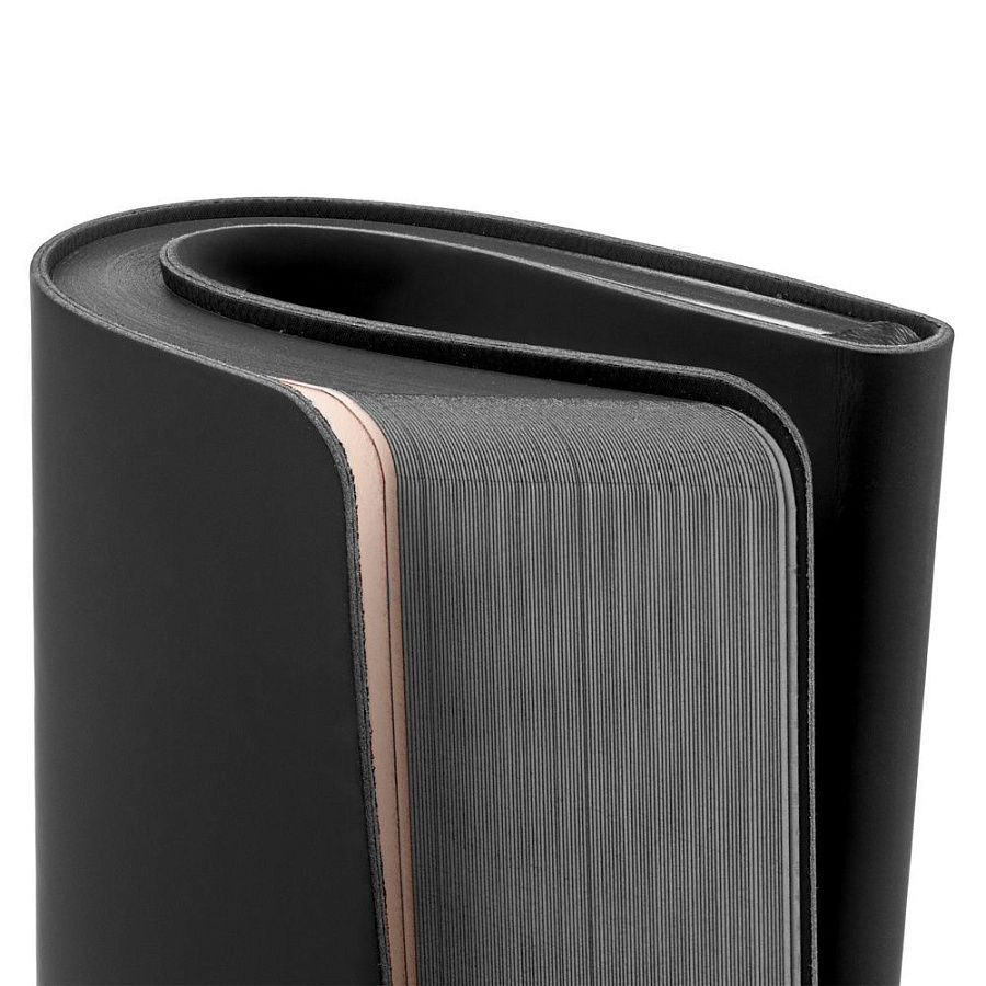Ежедневник с гибкой обложкой, выполнен из материалов Soft Touch Pearl, черный АА, и Latte, черный (внутренняя часть обложки), дополнен ляссе в цвет обложки с металлическим шильдиком.