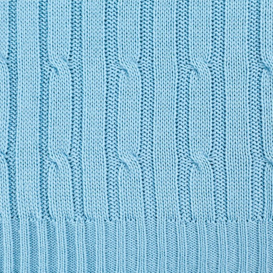 Модель: однотонный плед с фактурной вязкой, которая позволяет сделать его воздушным и объемным. Чередуя различные типы петель на гладком полотне, можно вывязать любую графику — логотип, текст, товарный знак.