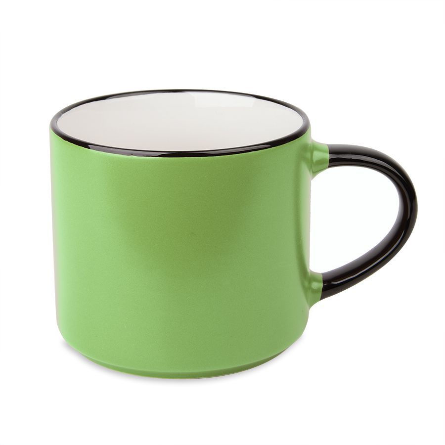 Ёмкая кружка трендовой цилиндрической формы с матовым покрытием.Яркий цветной корпус с черной ручкой и кантом по краю.Цвет близкий к Pantone 2256C