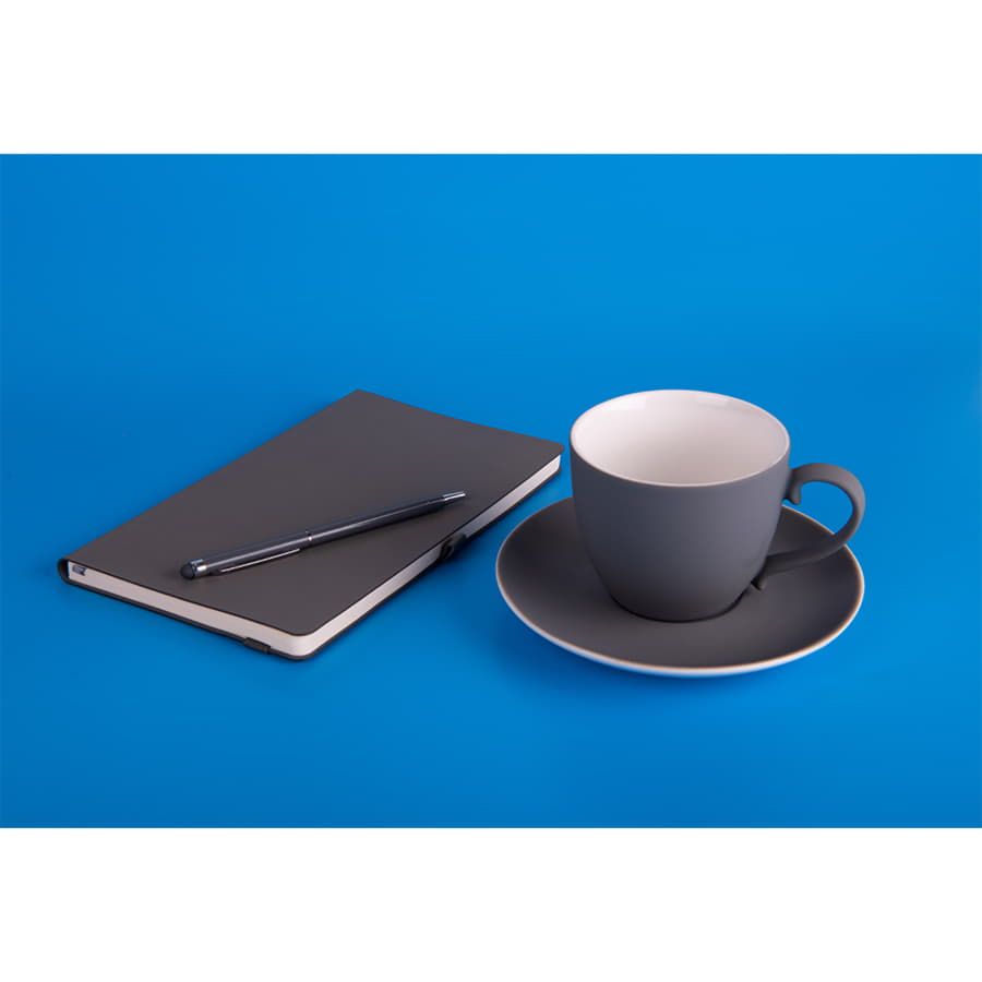 Чайная пара из фарфора с прорезиненным покрытием soft-touchЧашка классической формы и удобное глубокое блюдцеЦвет близкий к Pantone 2333CНе рекомендуется мыть в посудомоечной машине