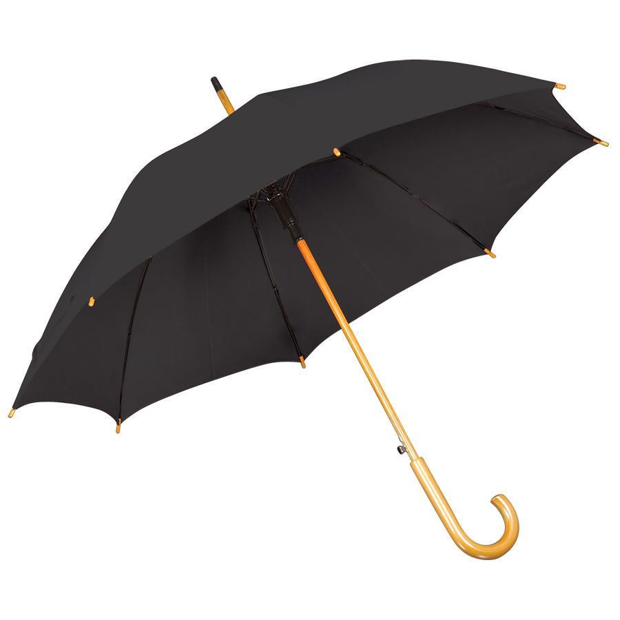 Зонт-трость с деревянной ручкой, полуавтомат. Диаметр купола: 103 см, длина стержня 90 см. Состав купола: 100% полиэстер 190T Состав спиц: металл. Ручка деревянная. Цвет купола: чёрный.
