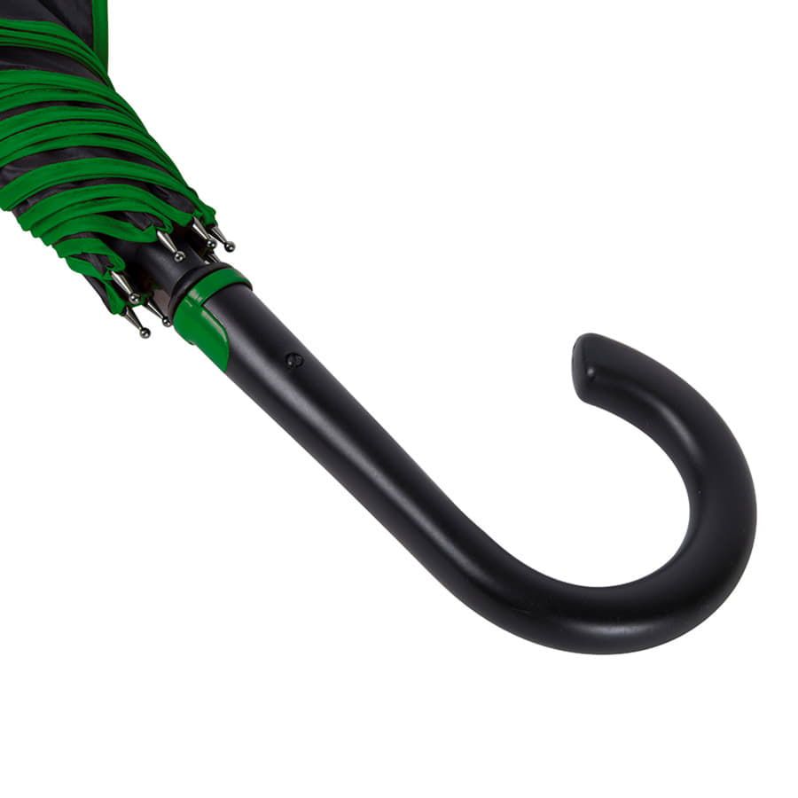 Зонт-трость с пластиковой ручкой, полуавтомат.Диаметр купола: 103 см, длина стержня 85 см.Состав купола: 100% полиэстер 190TСостав стержня: металл.Состав спиц: стекловолокно.Ручка пластик. Цвет купола: чёрный + кант зелёного цвета.