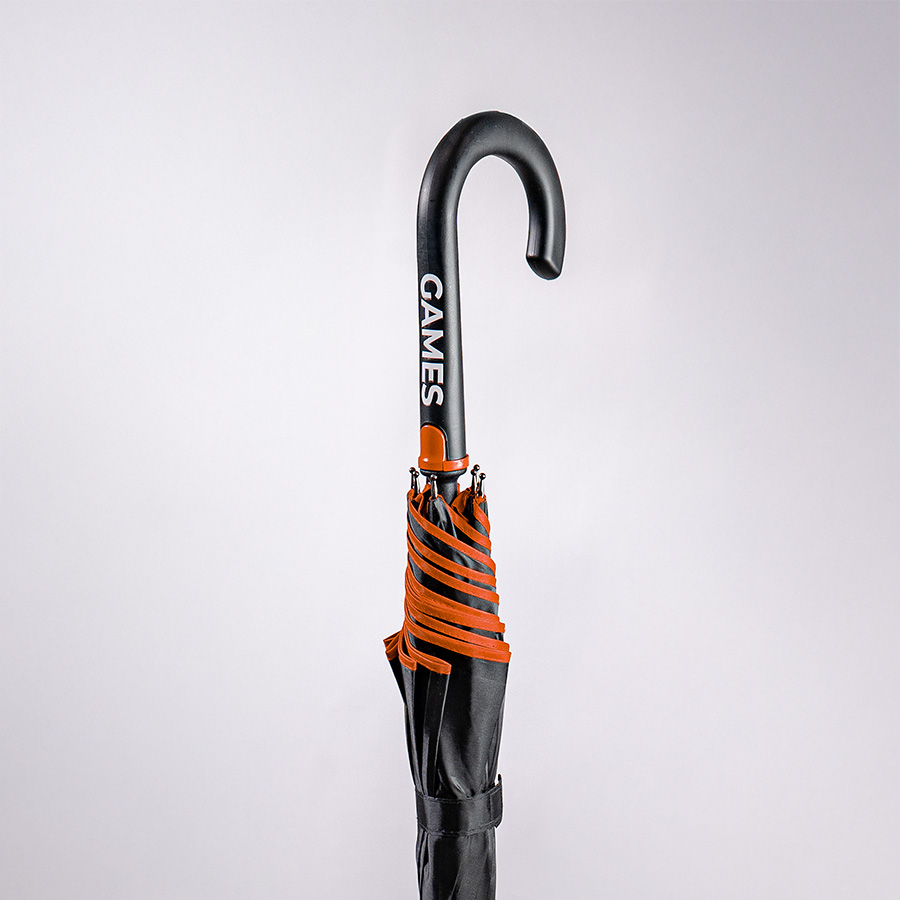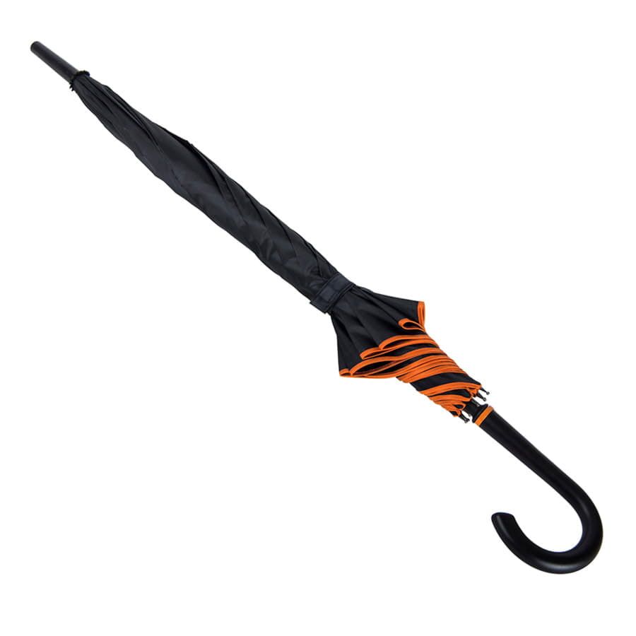 Зонт-трость с пластиковой ручкой, полуавтомат.Диаметр купола: 103 см, длина стержня 85 см.Состав купола: 100% полиэстер 190TСостав стержня: металл.Состав спиц: стекловолокно.Ручка пластик. Цвет купола: чёрный + кант и спицы оранжевого цвета.
