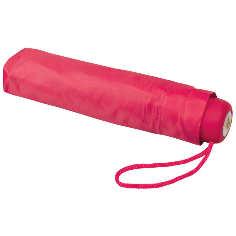 Зонт в 3 сложения, механический Диаметр купола: 95см Состав купола: 100% полиэстер 190T Состав спицы и стержень: металл Пластиковая ручка с soft - touch поверхностью. Длина ручки зонта в открытом состоянии 54,5 см от основания Цвет купола близкий Pantone 199 C Зонт в чехле из основного материала.