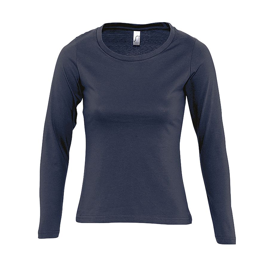 Женская футболка с круглым классическим вырезом и длинными рукавами. Модель с боковыми швами. Укрепляющая тесьма по вороту. Приталенный крой. Манжеты без резинки.