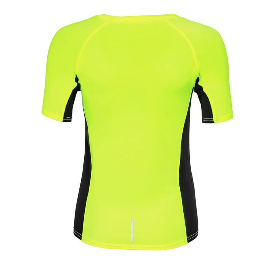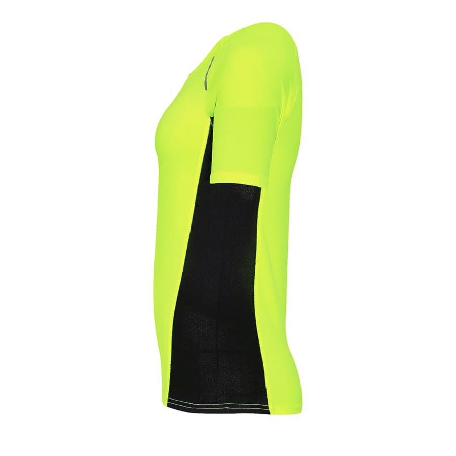 Женская футболка с рукавами реглан для занятий спортом со светоотражающими элементами. Боковые вставки из "дышащей" сетки предназначены для вентиляции и отвода влаги.