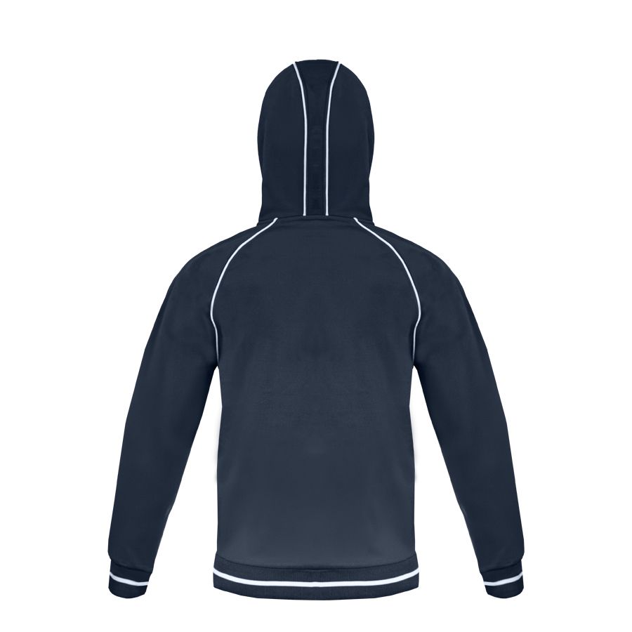 Основная ткань: цвет, близкий к Pantone 296 C Толстовка из полотна "пике" с водоотталкивающей пропиткой. Обратные контрастные молнии для предотвращения попадания влаги внутрь. Рукава-реглан. Декоративная тесьма по горловине спинки. Капюшон на подкладке с небольшой стойкой. Контрастные канты и шнур в капюшоне. Два передних кармана на молнии. Манжеты и низ изделия обработаны плотным рибом 1*1 .