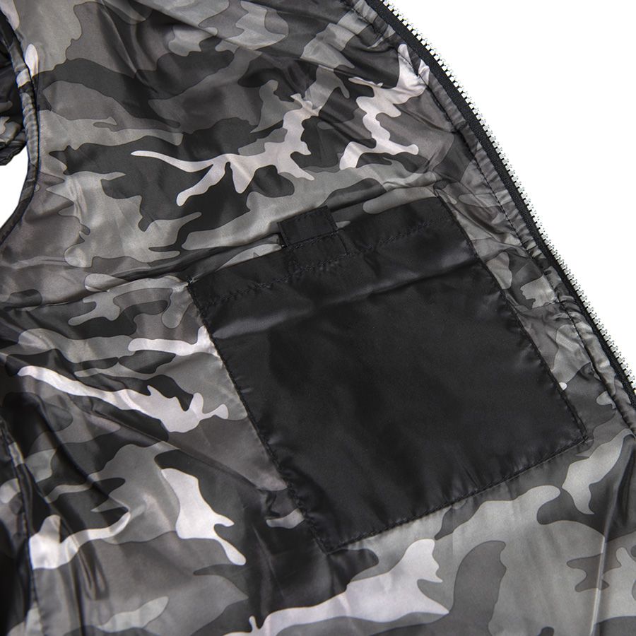 Основная ткань: цвет, близкий к Pantone 5395 U, подкладка: цвет, близкий к 567 U, 533 С, 7541 С Небольшой воротник-стойка. Контрастная облегченная пластиковая молния со съемным пуллером. Три передних кармана на молнии. Внутренний карман на липучке. Контрастная подкладка камуфляж.