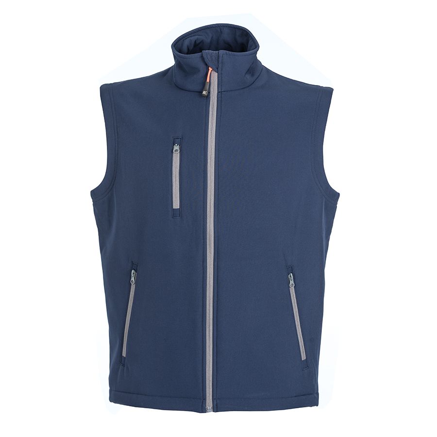 Основная ткань: цвет, близкий к Pantone 289 С, подкладка: цвет, близкий к Pantone 2965 C Двухслойная ткань softshell. Водонепроницаемый и дышащий мужской жилет. Небольшой воротник-стойка. Обратная контрастная пластиковая молния со съемным пуллером. Один нагрудный и два боковых кармана с обратной молнией. Утягивающий шнурок по низу жилета.