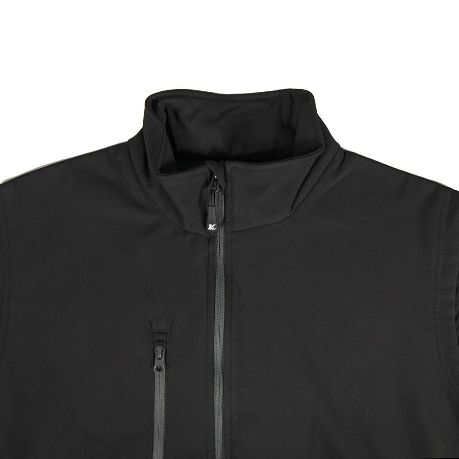 Двухслойная ткань softshell. Водонепроницаемый и дышащий мужской жилет. Небольшой воротник-стойка. Обратная контрастная пластиковая молния со съемным пуллером. Один нагрудный и два боковых кармана с обратной молнией. Утягивающий шнурок по низу жилета.