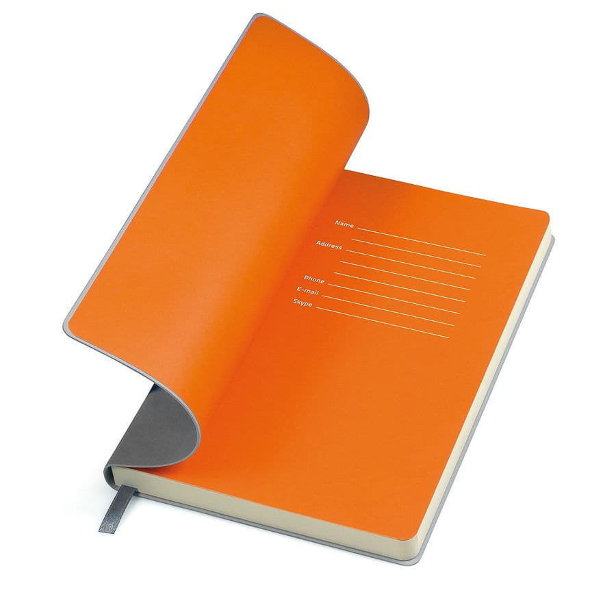 Блокнот с мягкой термоактивной обложкой и популярной комбинацией цветов Термоактивный PU материал Velvet Цвет обложки, близкий к Pantone 423C Цвет форзаца, близкий к Pantone Orange 021U Внутренний блок 256 страниц в линейку Идеально скругленные углы блока Перфорированные 8 последних листов Кремовая FSC бумага 70 г м2 Ляссе в тон обложки Индивидуальная упаковка: фирменный сливбокс thINKme