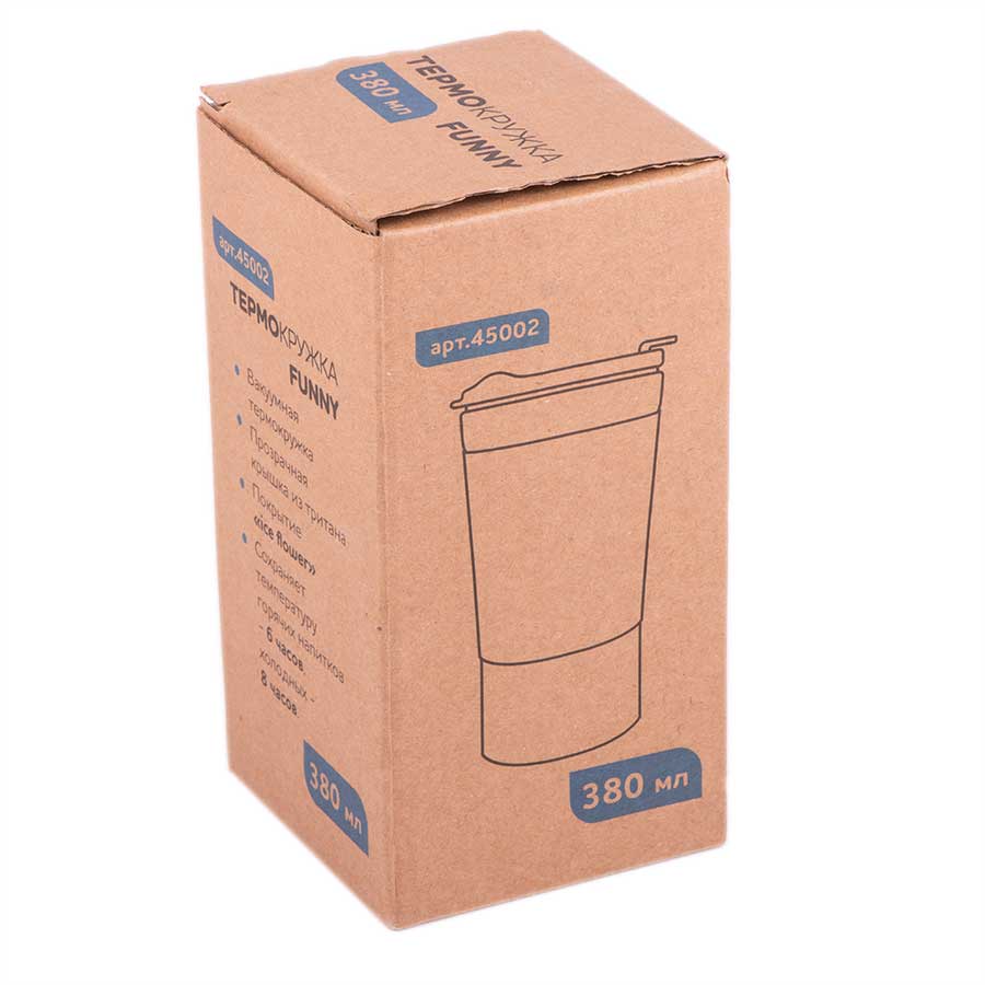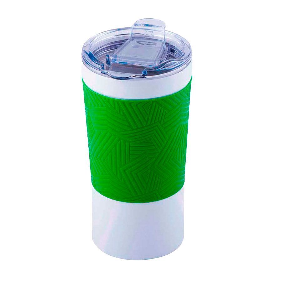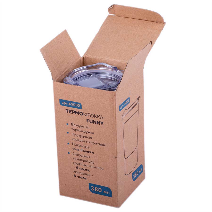 Вакуумная термокружка с покрытием "ice flower" и силиконовой манжетой.Закручивающаяся крышка выполнена из высококачественного прозрачного пластика - тритан.Сохраняет температуру горячих напитков до 6 часов, холодных напитков - до 8 часов.Подходит для автомобильных подстаканников. Цвет близкий к pantone 355C.