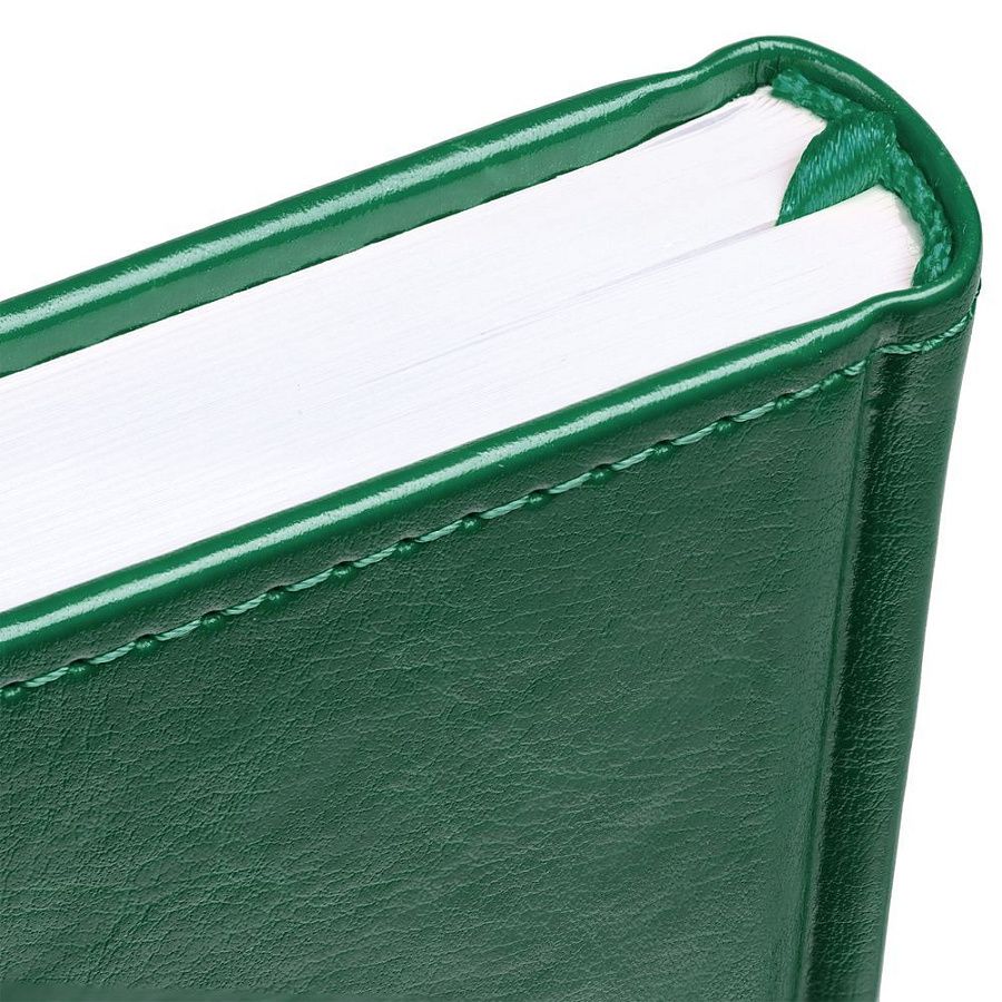 Ежедневник с твердой обложкой без поролона, выполнен из материала Nebraska, зеленый FF, дополнен ляссе и капталом в цвет обложки.