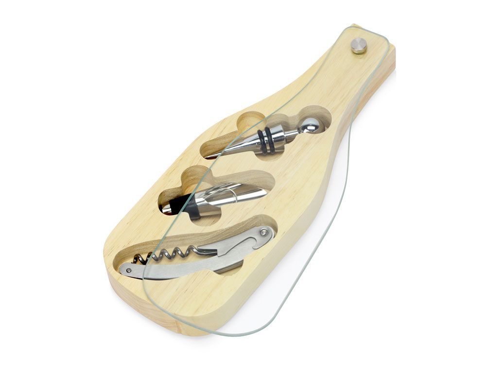 Деревянная часть футляра имеет три вырезанные ниши под каждое из приспособлений для вина, дополненные выемками под пальцы для удобного извлечения.