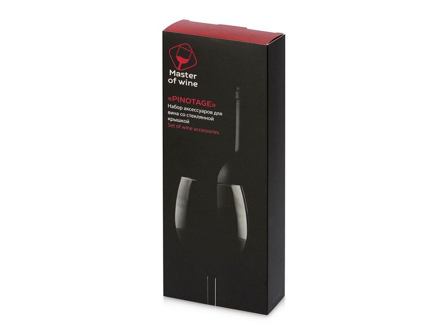 Набор аксессуаров для вина от Master of Wine выполнен в виде футляра из дерева со стеклянной крышкой с разместившимися внутри штопором, пробкой и аэратором.