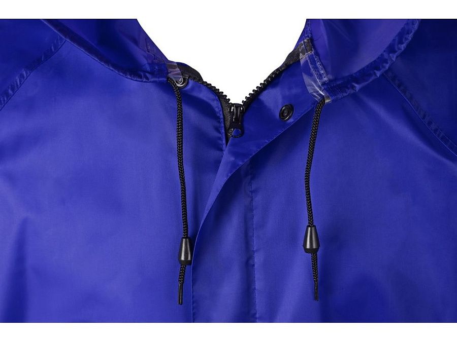 Длинный дождевик выполнен из полиэстера с водоотталкивающей пропиткой. Застегивается на молнию, поверх которой — планка на кнопках, что дополнительно защищает от ветра и промокания. Посадку капюшона можно регулировать при помощи шнурка, ширина рукава регулируется кнопкой.