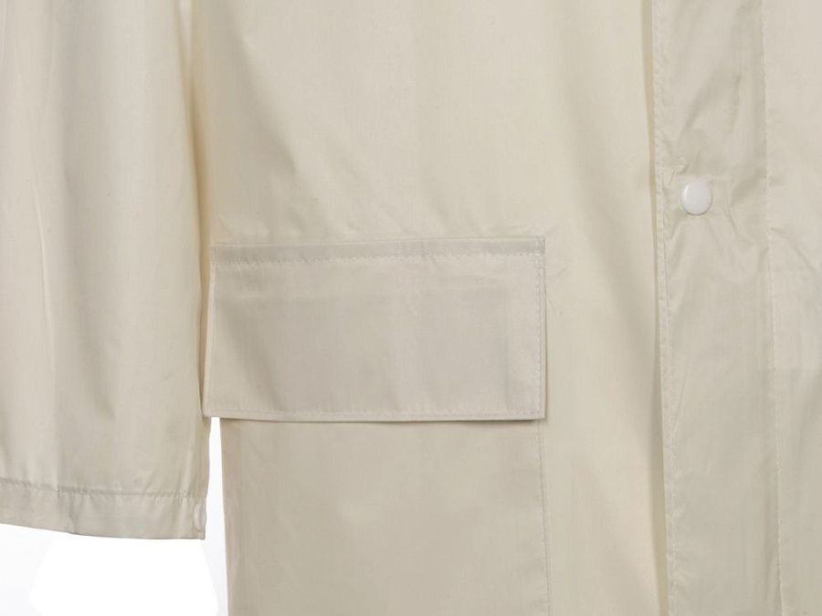 Длинный дождевик выполнен из полиэстера с водоотталкивающей пропиткой. Застегивается на молнию, поверх которой — планка на кнопках, что дополнительно защищает от ветра и промокания. Посадку капюшона можно регулировать при помощи шнурка, ширина рукава регулируется кнопкой.