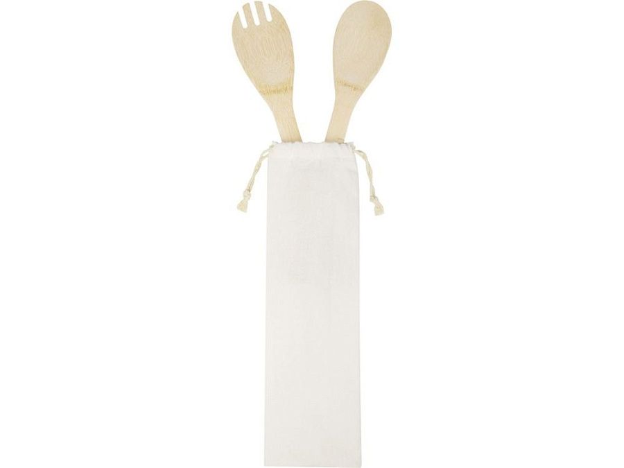 Бамбуковый комплект из салатной ложки и вилки, удобный для повседневных семейных ужинов. Используемый бамбук поставляется и производится в соответствии со стандартами устойчивого развития.