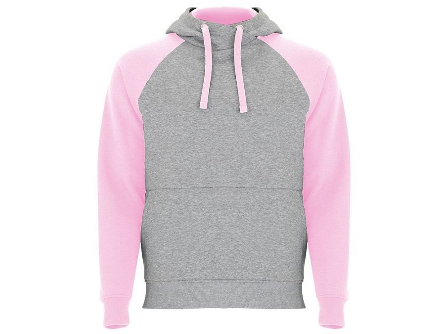 Худи с контрастным рукавом реглан. Капюшон с запахом, с контрастной подкладкой и шнурком. На полочке карман кенгуру. Манжеты рукавов и низ изделия из риба 1х1.