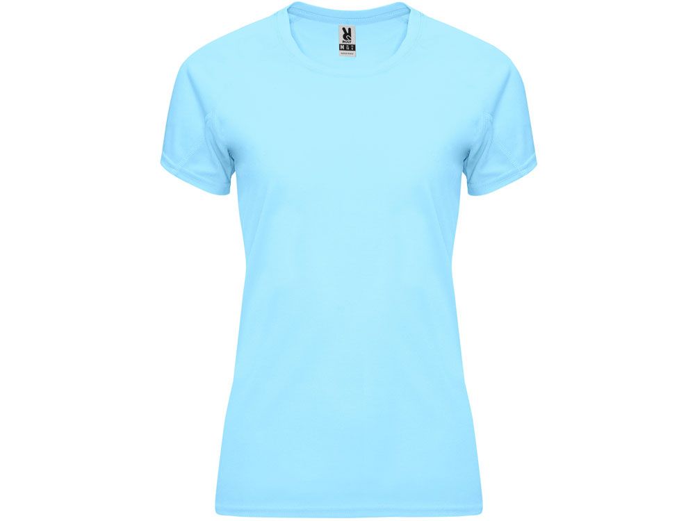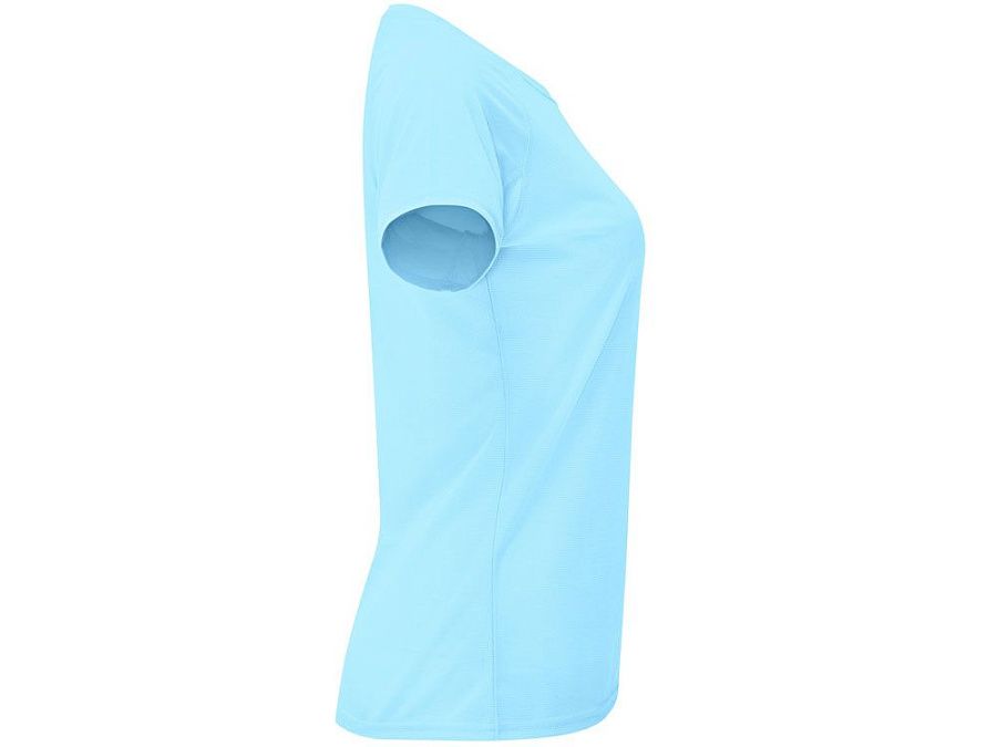 Спортивная футболка с коротким рукавом реглан для женщин. Круглый вырез горловины с отделкой плоским швом. Рукав сложного кроя для обеспечения дополнительного удобства при занятиях спортом. Отделка плоским швом с застилом по пройме и рукавам.