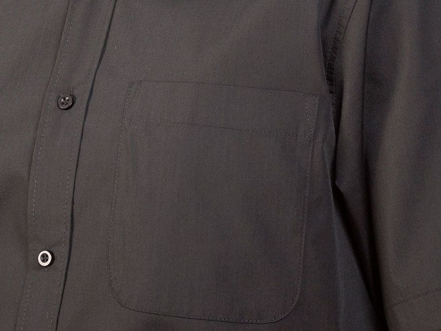 Рубашка мужская с коротким рукавом на семи пуговицах. Накладной карман на груди слева, закругленный низ изделия. Уголки воротника продублированы пуговицами.