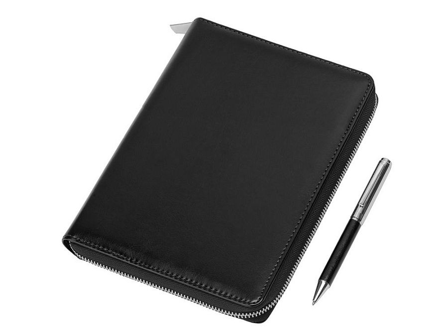 Бизнес блокнот Fabrizio состоит из пенала на молнии выполненного из искусственной кожи, и сменной тетради на 80 листов на кольцах с перфорированными линованными листами белого цвета.