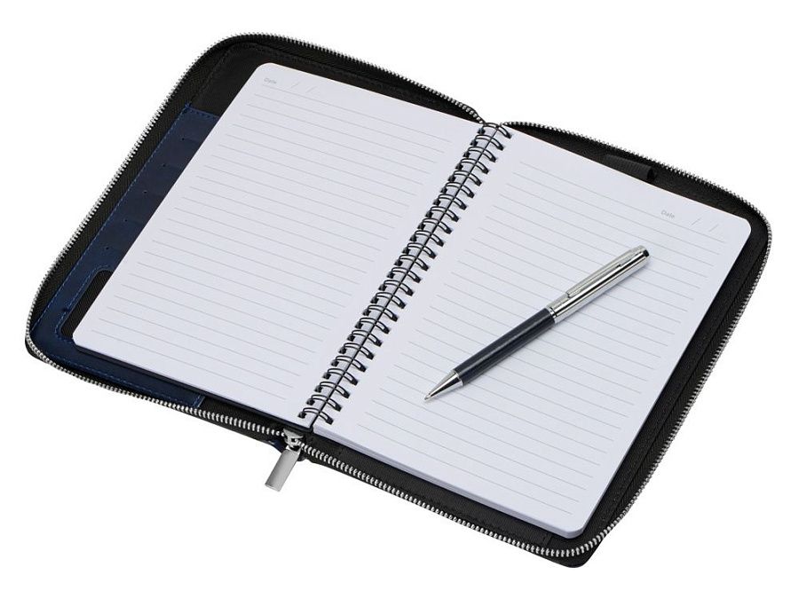 Бизнес блокнот Fabrizio состоит из пенала на молнии выполненного из искусственной кожи, и сменной тетради на 80 листов на кольцах с перфорированными линованными листами белого цвета.
