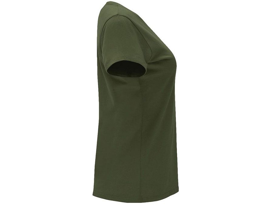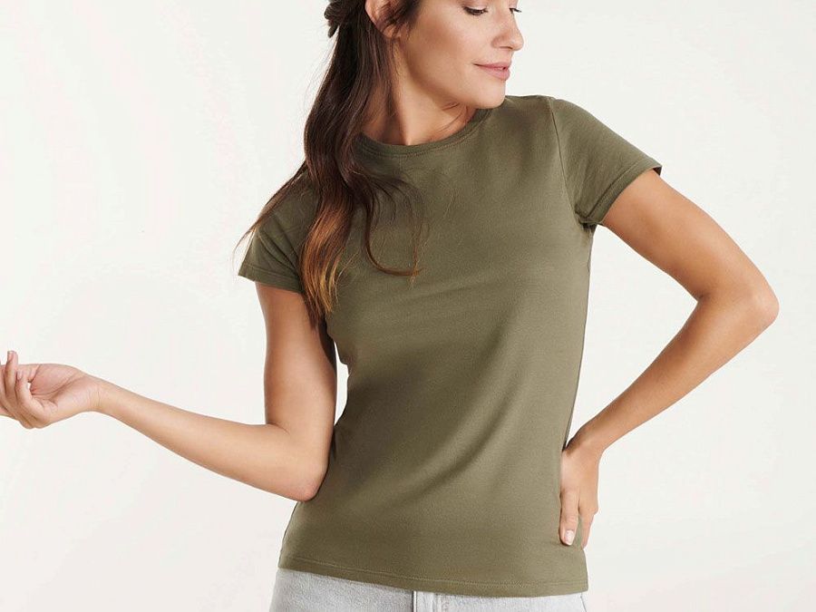 Женская приталенная футболка. Круглый вырез горловины обработан рибом 1х1. Шов горловины укреплен тесьмой.