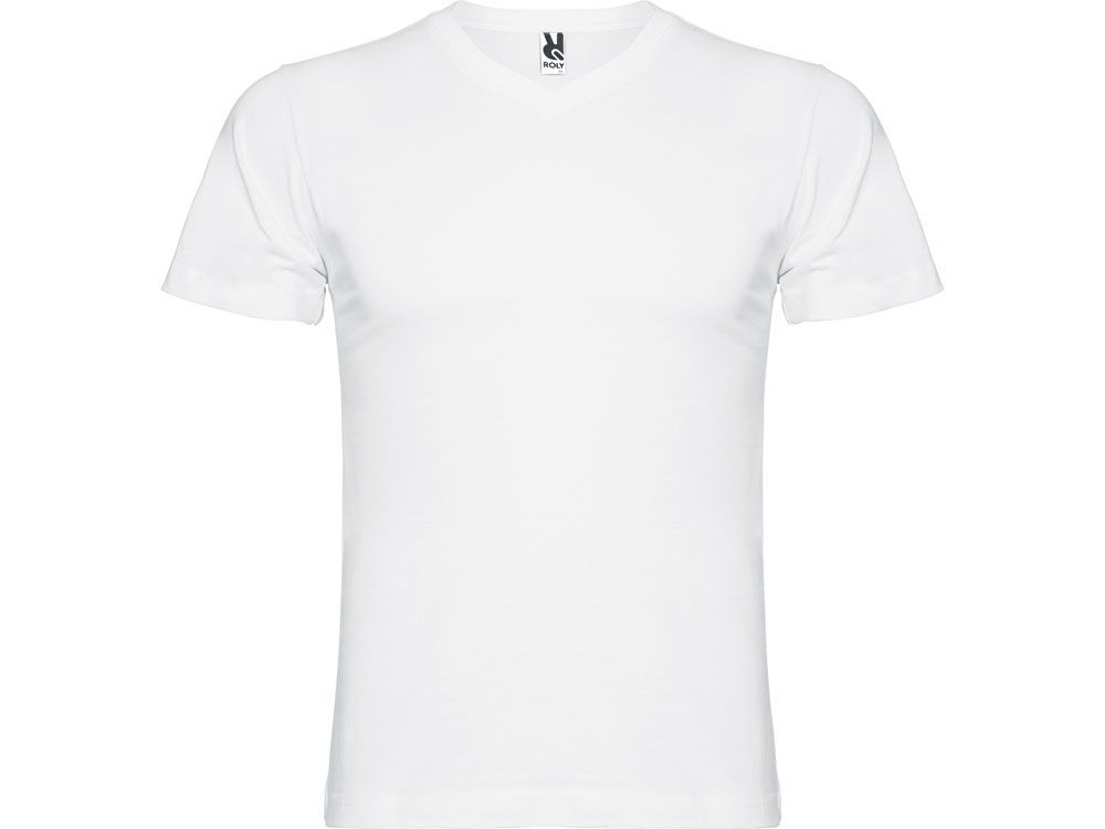 Мужская футболка без боковых швов с коротким рукавом и V-образным вырезом горловины, отделанном рибом 1х1. Горловина и плечевые швы дополнительно укреплены тесьмой.