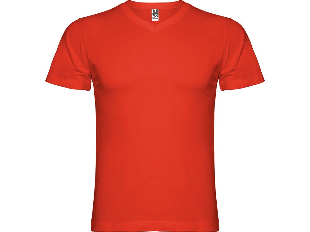 Мужская футболка без боковых швов с коротким рукавом и V-образным вырезом горловины, отделанном рибом 1х1. Горловина и плечевые швы дополнительно укреплены тесьмой.