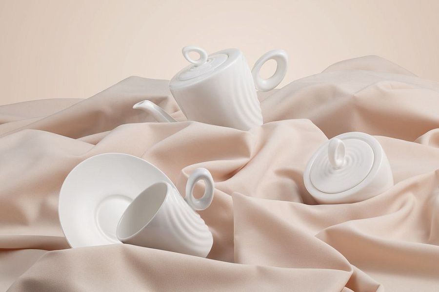 Форма сервиза создана в скульптурной технике: фарфор словно запечатлел сам момент движения. Необычная ручка предметов символизирует камень, от которого появляются завораживающие круги на воде — корпусе изделия.
