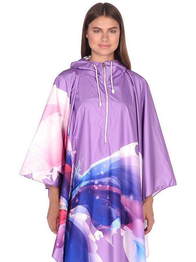 Легкий городской дождевик-пончо с регулируемым капюшоном из влагоустойчивого материала подходит для защиты в непогоду, свободно одевается поверх одежды и небольшого рюкзака.