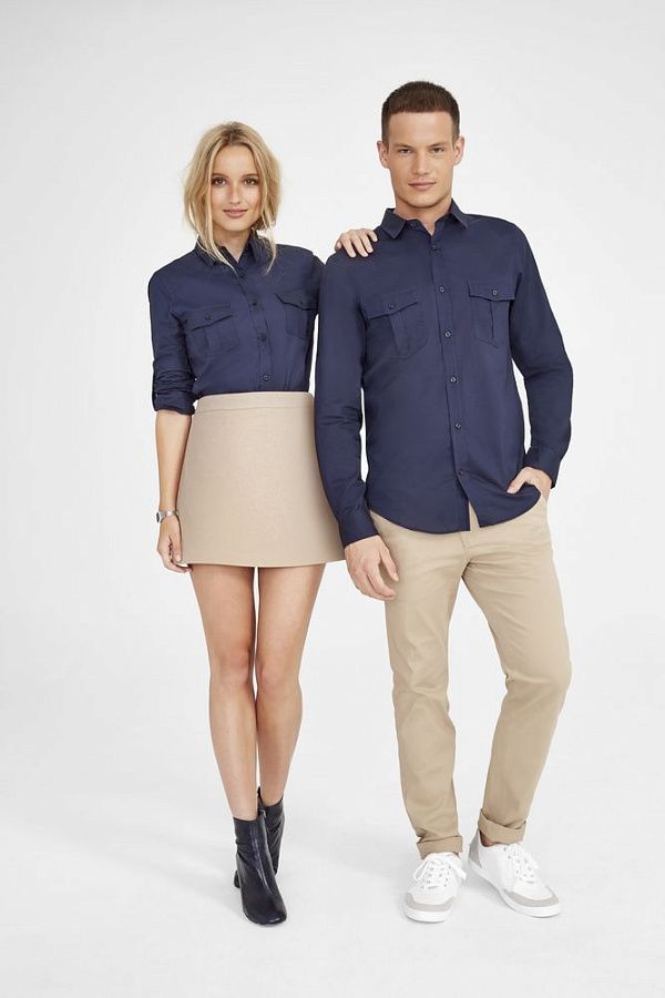Рубашка прямого кроя в стиле «сафари» с планкой на 7 пуговиц в тон и манжетами на 1 пуговице.