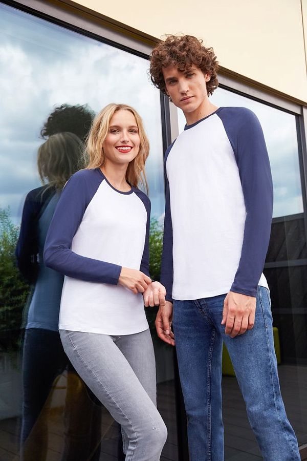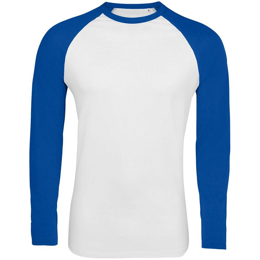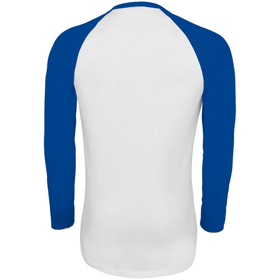 Мужская двухцветная футболка с боковыми швами, длинным рукавом реглан и закругленным низом.