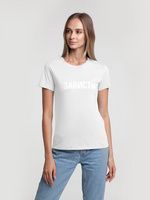 Тем, у кого она черная, не позавидуешь! Идеально белая элегантная футболка не может вызывать у окружающих ничего иного, кроме белой зависти. Чувство, которое неизбежно следует за людьми, умеющими одеваться просто и со вкусом, нужно уметь встречать грудью.Кроеная женская футболка с круглым воротом-резинкой (рибана 1x1 с лайкрой).