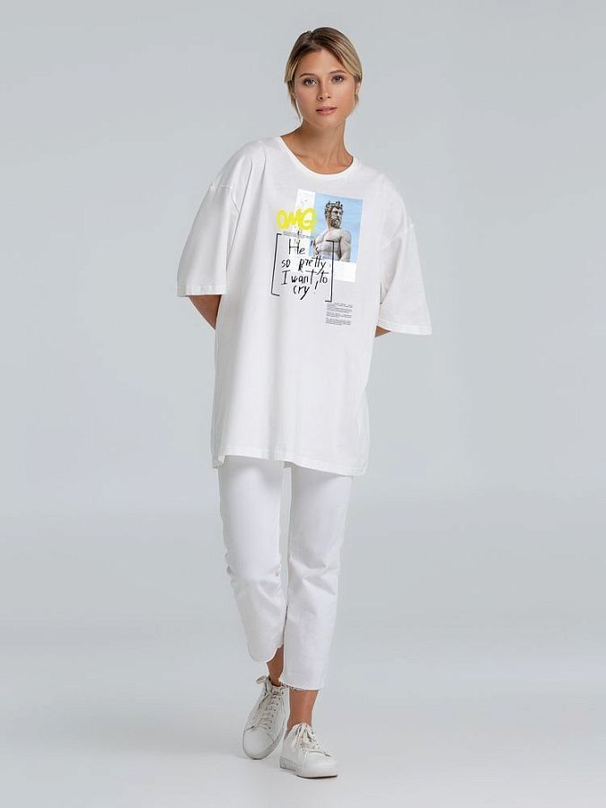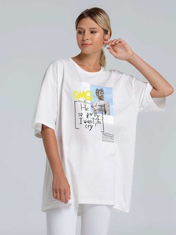 Футболка унисекс со спущенным плечом и круглым вырезом, отделанным резинкой.