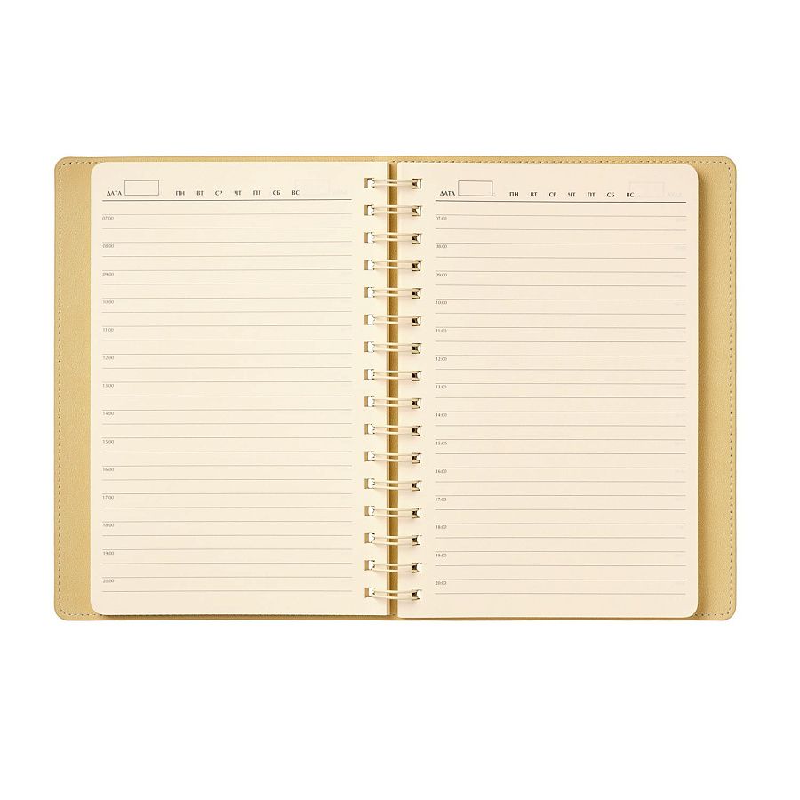 Внутренний блок с кремовыми страницами и срезом гармонично сочетается с нежным оттенком форзаца и нахзаца, повторяющим цвет внутреннего материала обложки. Надежная полускрытая пружина обеспечивает удобство использования и долговечность.
