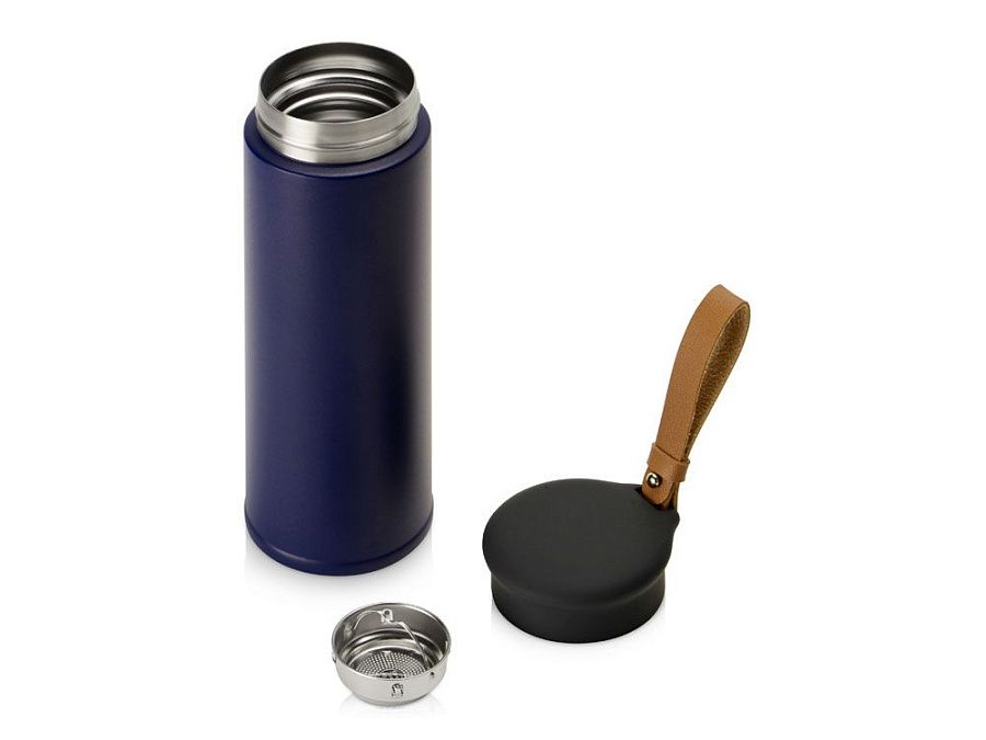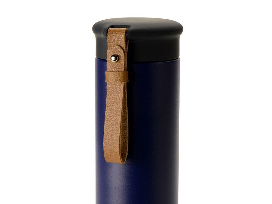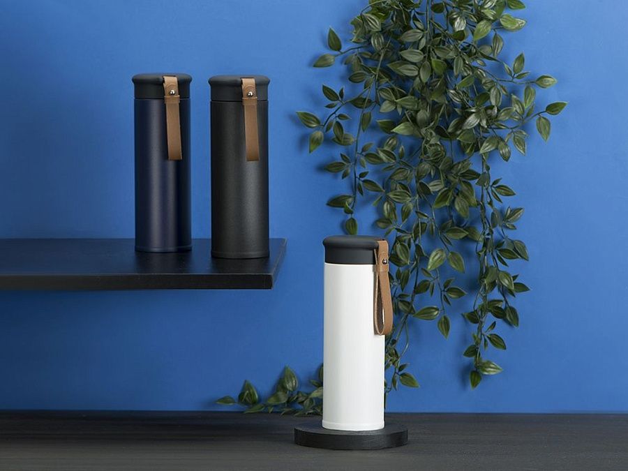 Термос герметично завинчивается на крышку, оснащенную съемным ремешком из качественной ПУ кожи. Крышка имеет прорезиненное покрытие, что создает интересное сочетание текстур в рамках одной модели. Корпус имеет элегантную рельефную поверхность с антискользящим эффектом.